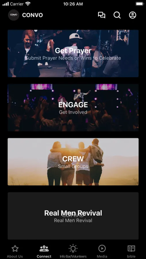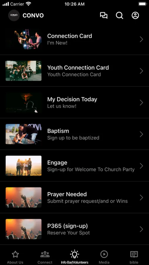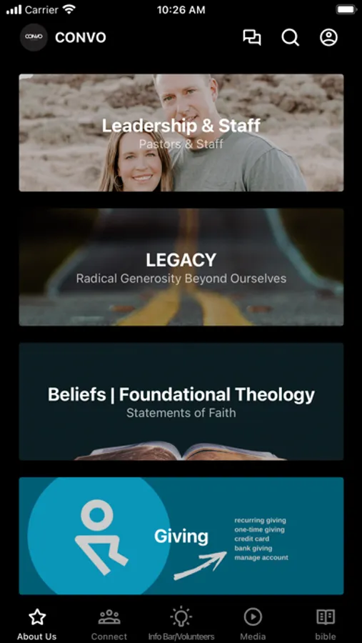 The CONVO App is designed to foster greater personal connection, communication, and discipleship within the CONVO Church community and our Dream Team, which is our team of staff and volunteers. With this app you can: watch or listen to past messages; stay up to date with push notifications; share your favorite messages via Twitter, Facebook, or email; and download messages for offline listening. You can communicate with your Team(s) and Leader(s), share WINS and Prayer Requests.