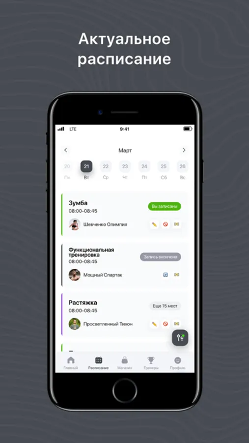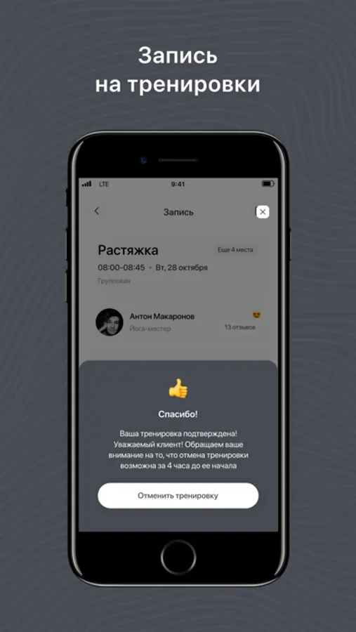 - Получать PUSH-уведомления о предстоящей тренировке за 3 часа;