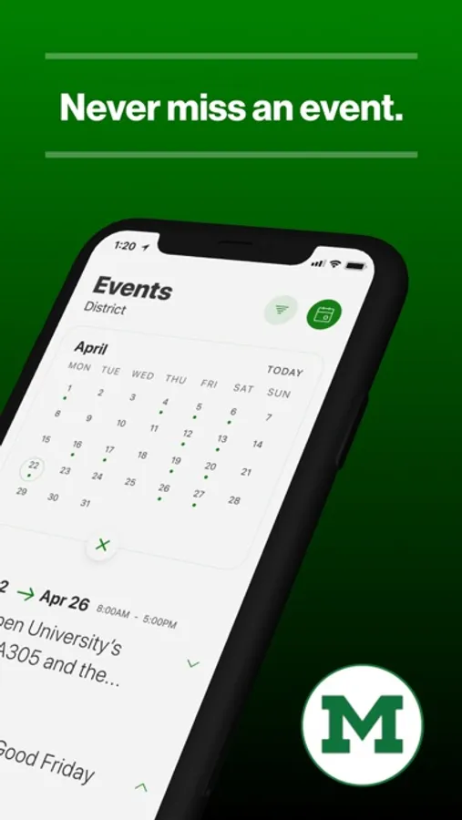 The event section shows a list of events throughout the district. Users can add an event to their calendar to share the event with friends and family with one tap.