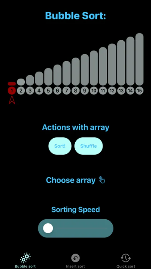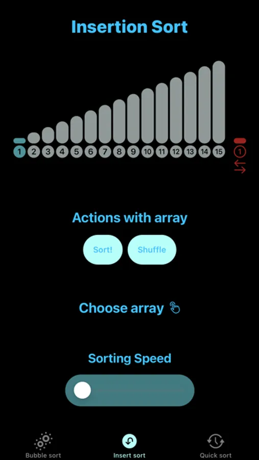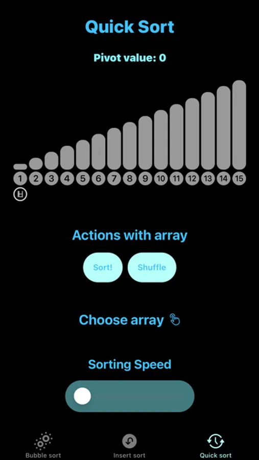 The application shows visually how the sorting algorithms work. You can change the sort speed, choose from different types of data: sorted, almost sorted, inverted, sorted. There is also the possibility of shuffle the data.