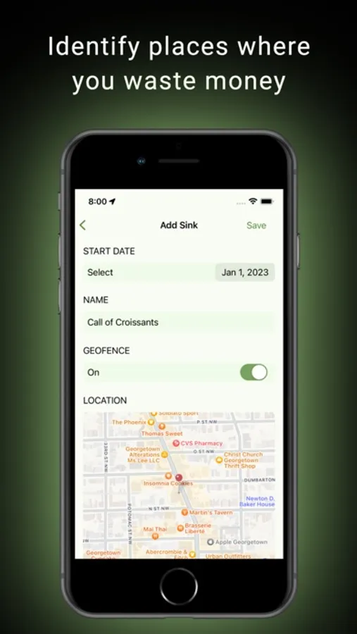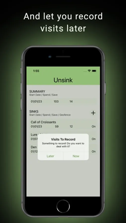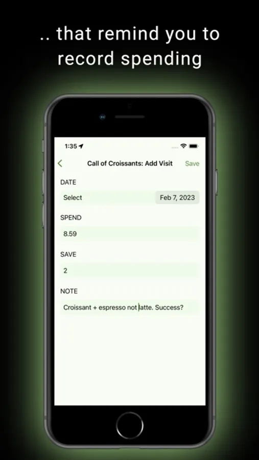 You set up geofences around places where you overspend. The visits there trigger notifications that remind you to spend less and to record spending. You can record a visit on the fly or tap on the notification on your iPhone or WatchOS to add to the list of visits that need recording.