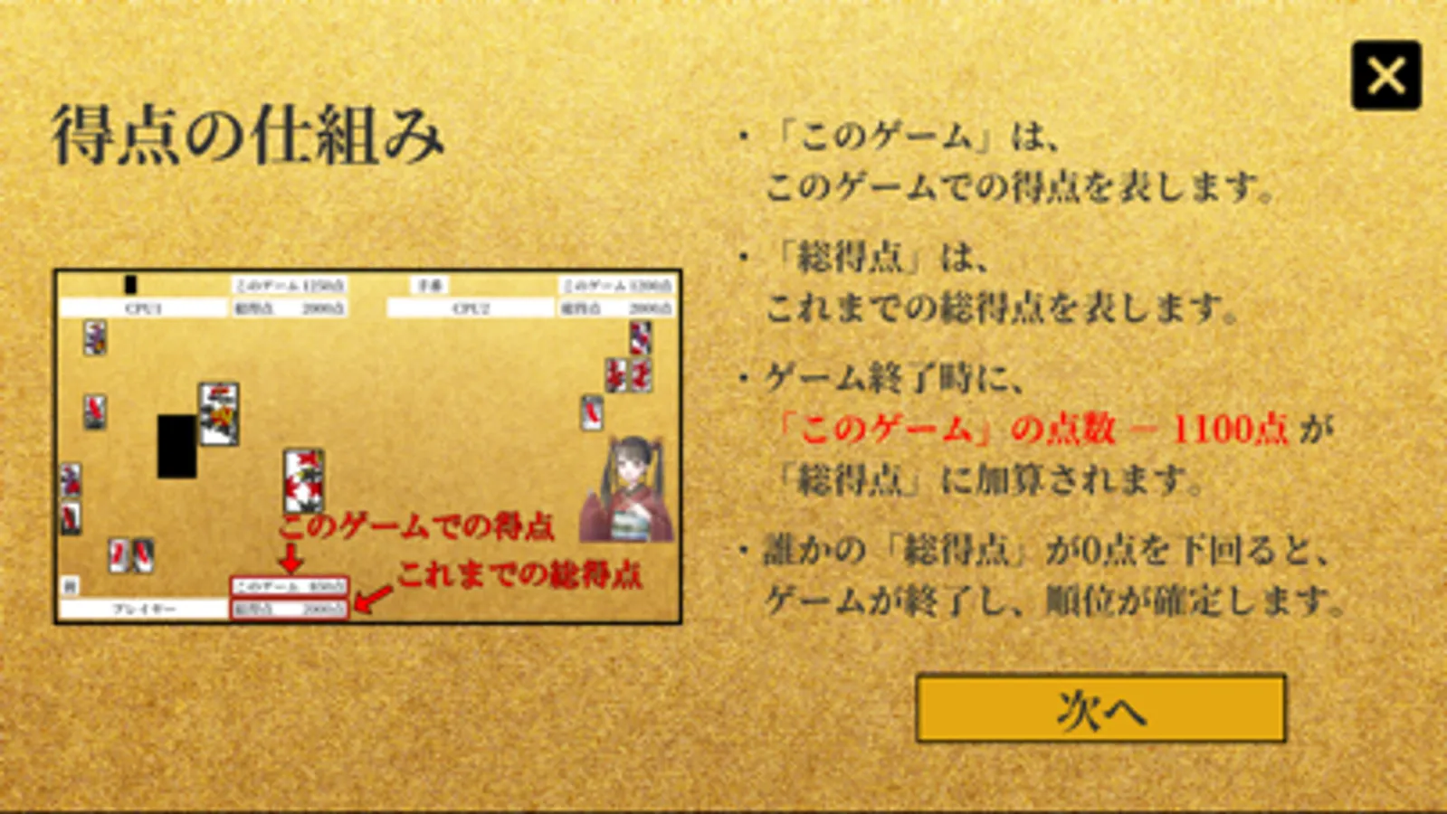 ・100年以上前、私の祖父の時代には既に存在していた地域限定ルールで、一部の地域で一子相伝で受け継がれてきました。これをアプリ用に開発、気軽に遊べるように仕様を変更しています。有名ルールにはない、3人プレイにしかない絶妙なバランスの展開をお楽しみください。