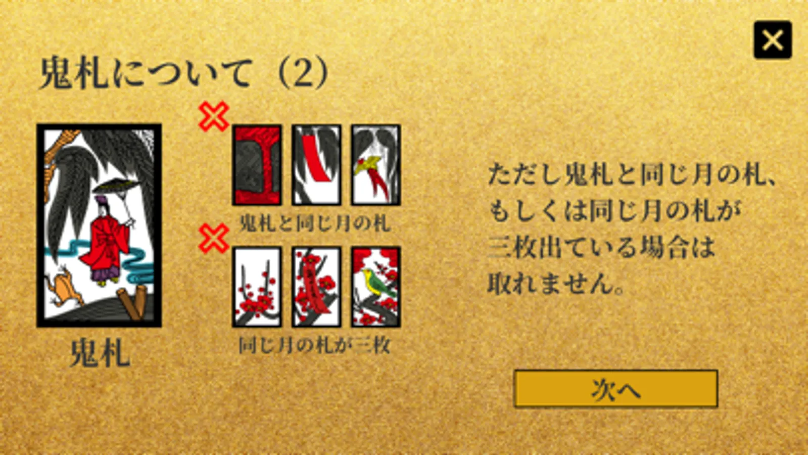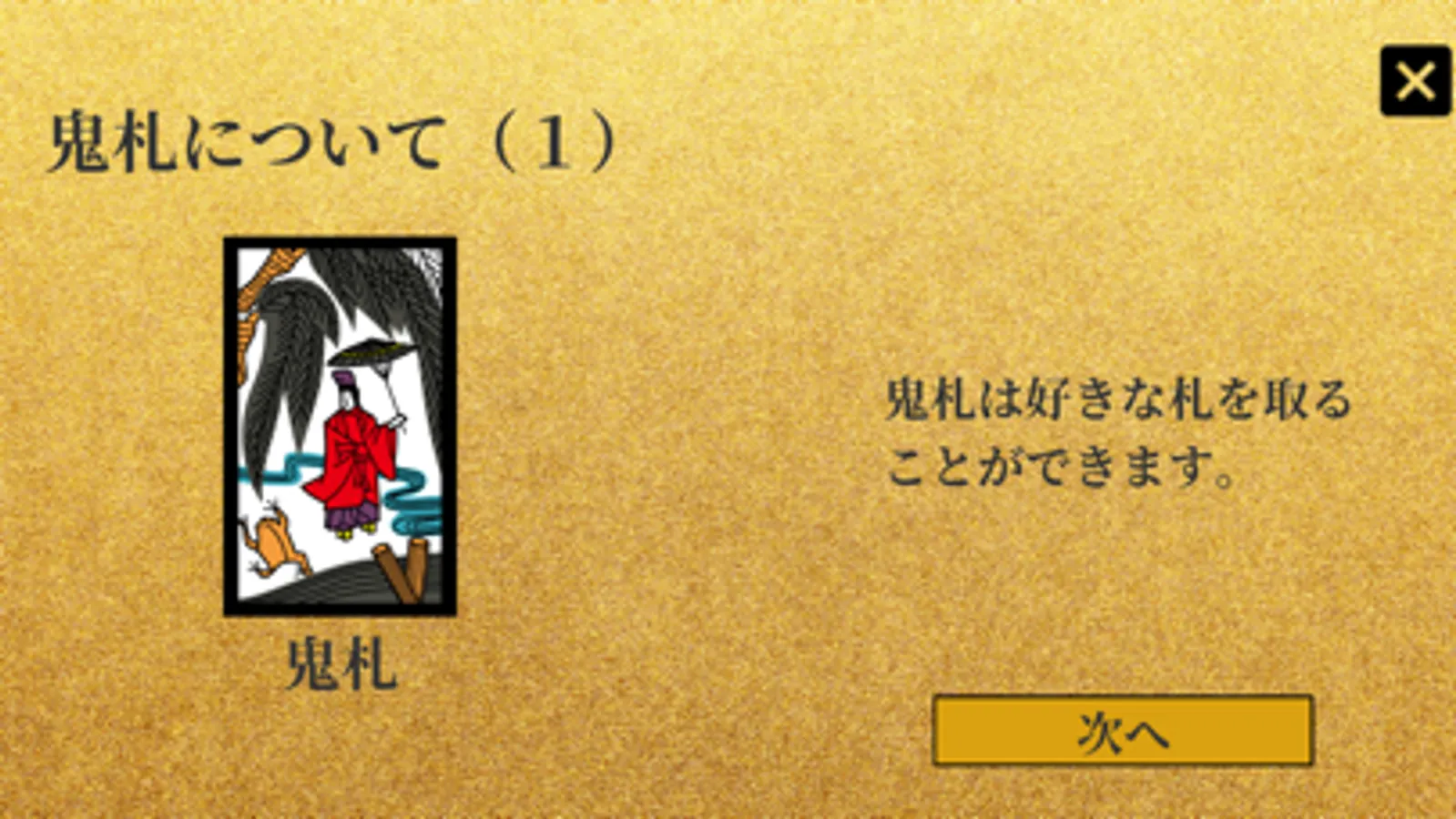 このゲームの重要な札・・・それは鬼札です(画像参照)この鬼札は、自季節札以外の全ての札を噛む(取る)事ができるジョーカーのような札になっています。この札を駆使して短冊を揃えてみてください。