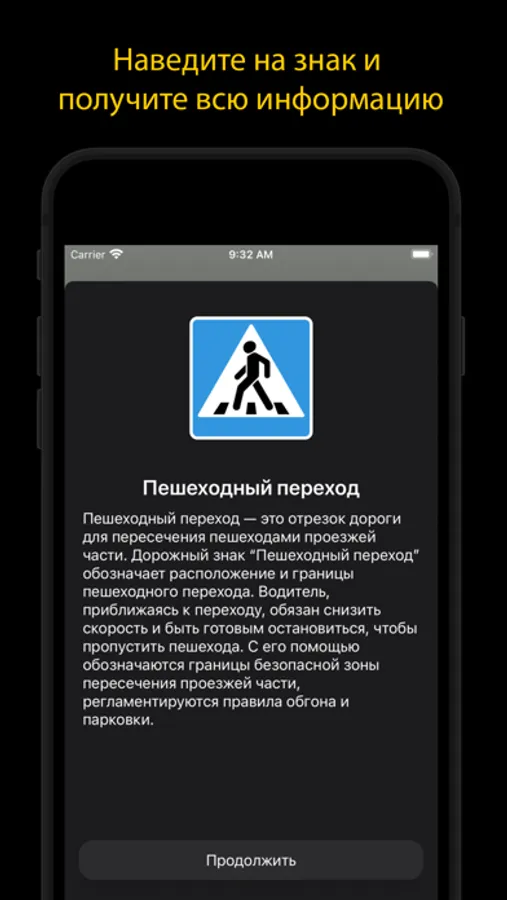 Приложение распознает дорожные знаки, которые можно встретить на улицах. Просто наведите камеру телефона на знак и вы увидите его описание, принцип действия, накладываемые ограничения и т.д.