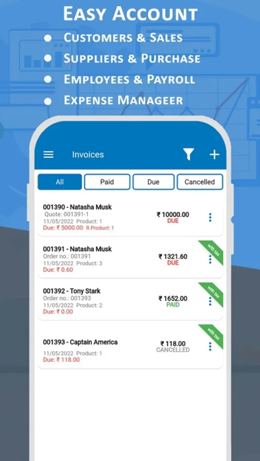 Easy Account is a complete solution for managing invoices and billing operations, generating invoice is simple and fast .create and send an invoice immediately, and you can add tax and also create a tax invoice. you get a due invoices list and make sure to get paid for your invoice on time so send timely Notification to recover payments, record business expenses.
