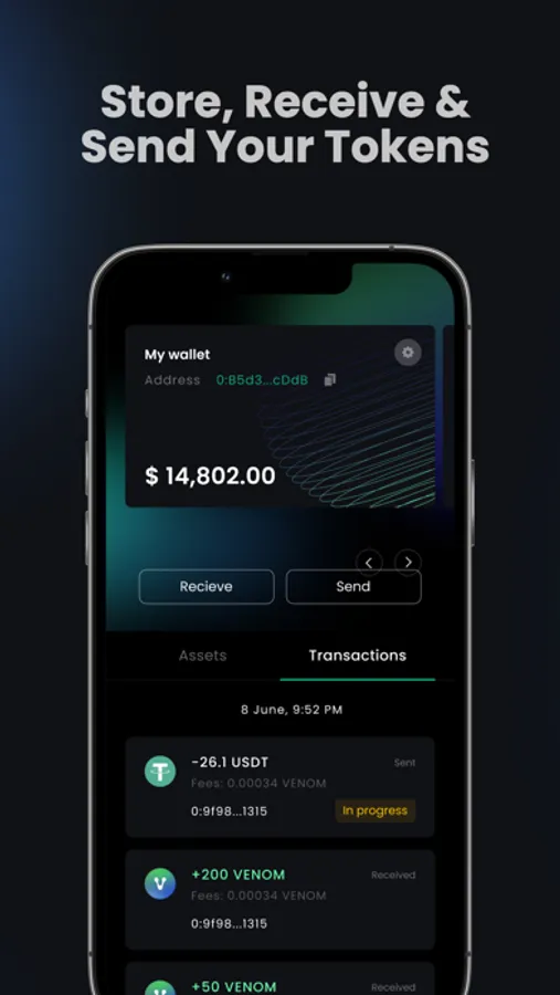 Venom non-custodial Wallet providing the ability to use your tokens safely, as all the private keys are stored locally on the device. Create default or multi signature wallet, receive and send tokens from one wallet to another.