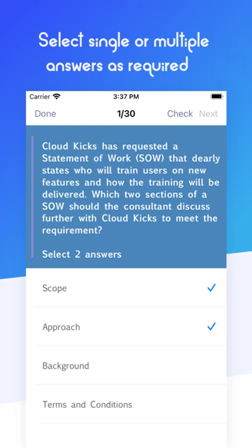 The quiz contains 90 questions about various Sales Cloud topics divided into 3 groups of 30 questions. This smaller segmentation allows to practise and revise in smaller time intervals, where some questions may appear very similar to the real exam, others will fill the knowledge gaps. The purpose of the revision quiz is to go through Sales Cloud logic so you can make the correct decision when a question is presented in real exam. The types of questions are the same format as the exam: