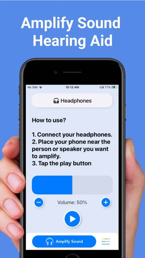 This app allows you to amplify the sound around you using your phone and headphones. Simply place your phone near the sound you want to amplify and use it as a hearing aid.