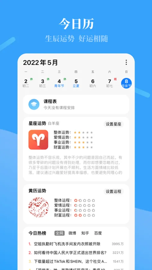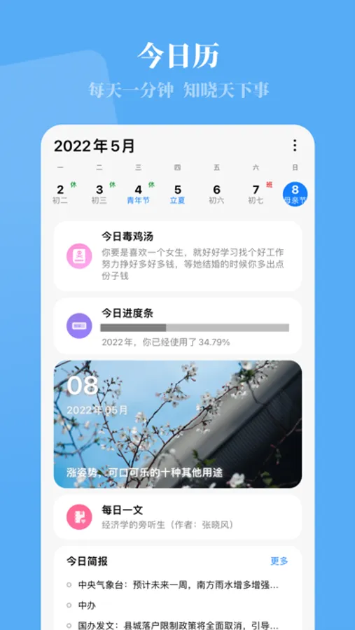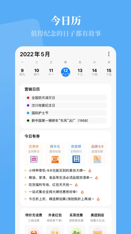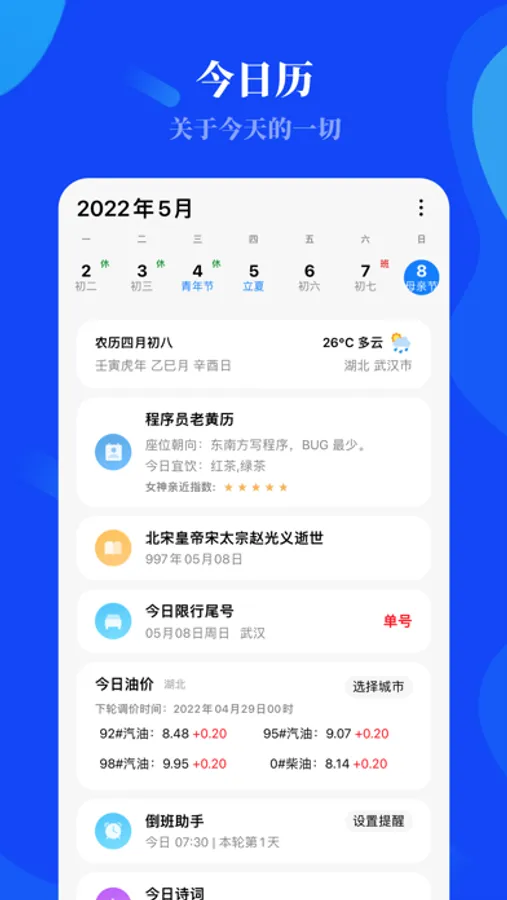 「今日历」是一款专业精美的日历 App,提供老黄历、万年历、历史上的今天、今日限行、今日油价、今日热榜、今日早报、今日晚报……以上目之所及,只是开始。一切,都不会那么简单,一切,都力求简单。是你必不可少的生活助理。
