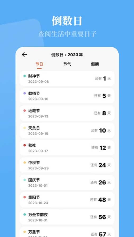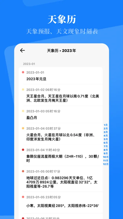 万年历包括但不限皇历、生辰八字、日出月落、农历、黄历、干支、节气、月相、经纬度、节假日、伊斯兰历、儒略历、天文历、回历、西历、佛历、道历、星座、生肖、节日、彭祖百忌、每日宜忌、吉神宜趋、凶煞宜忌、吉神方位、冲煞、纳音、星宿、八字、五行、十神、建除十二值星、青龙名堂等十二神、黄道日及吉凶等等。