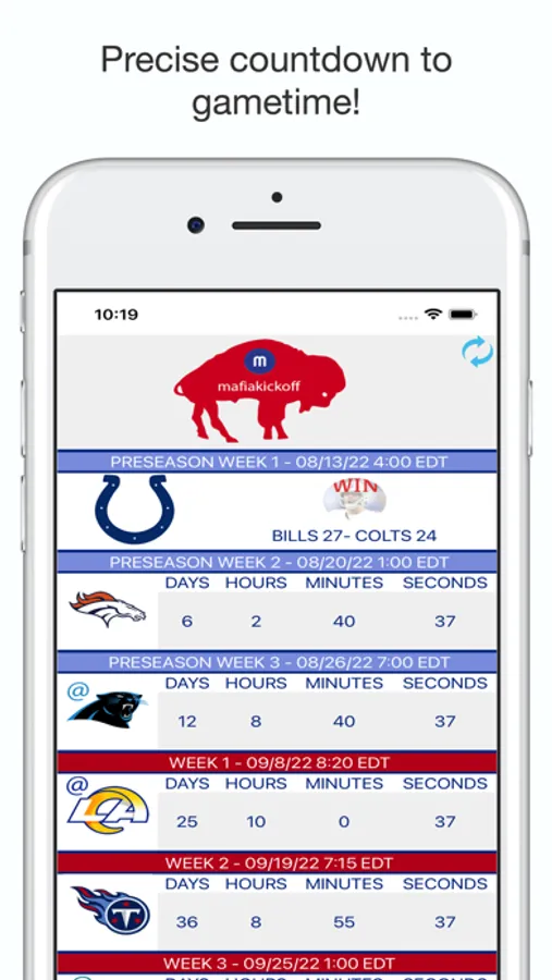 MafiaKickoff is a simple schedule countdown for the Bills season. It tells you how long you have to wait until the next game.