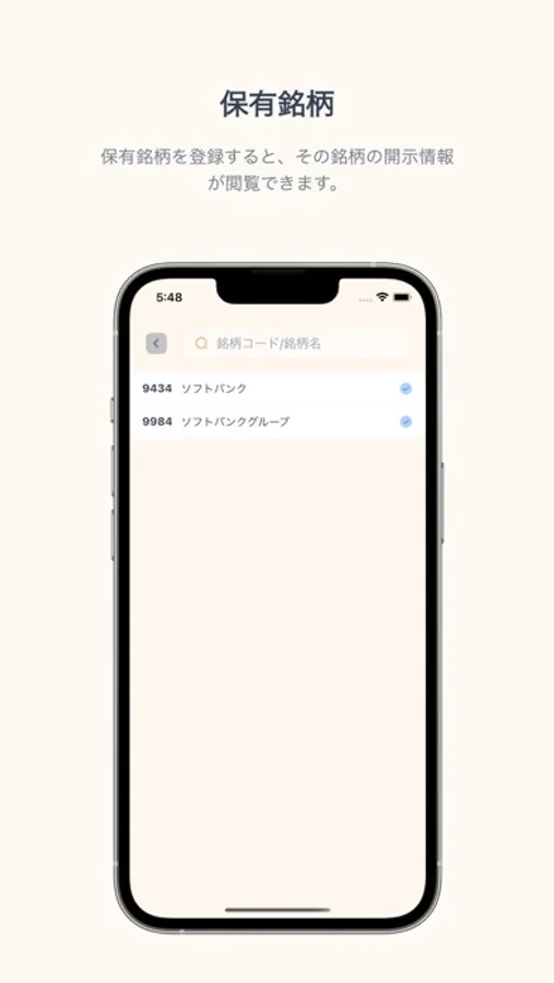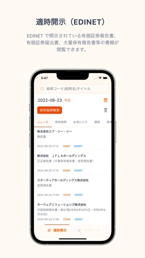 ・保有銘柄 : 保有銘柄を登録すると、その銘柄の開示情報が閲覧できます