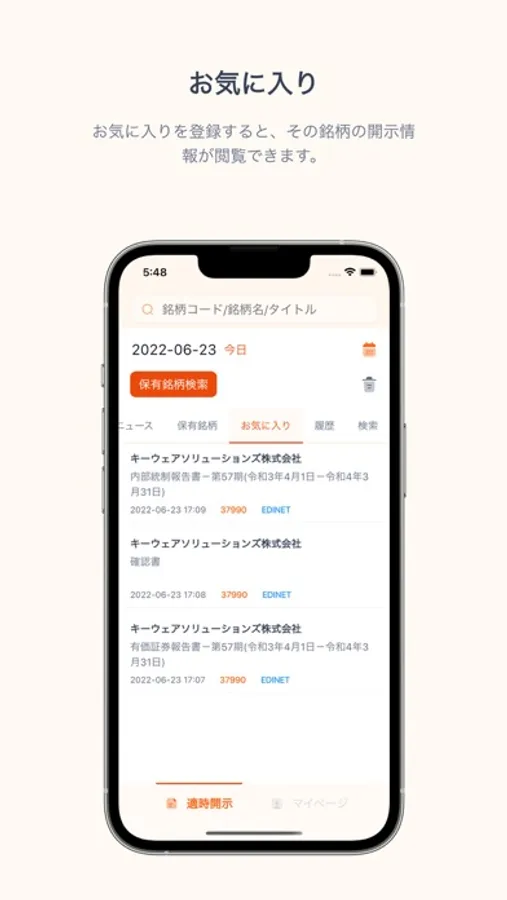 ・お気に入り : お気に入りを登録すると、その銘柄の開示情報が閲覧できます