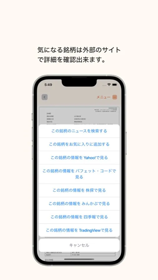・検索 : 銘柄コード、銘柄名で検索してアプリ内に保存されている情報を検索することが出来ます