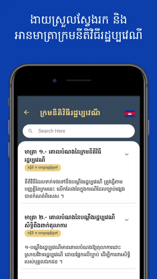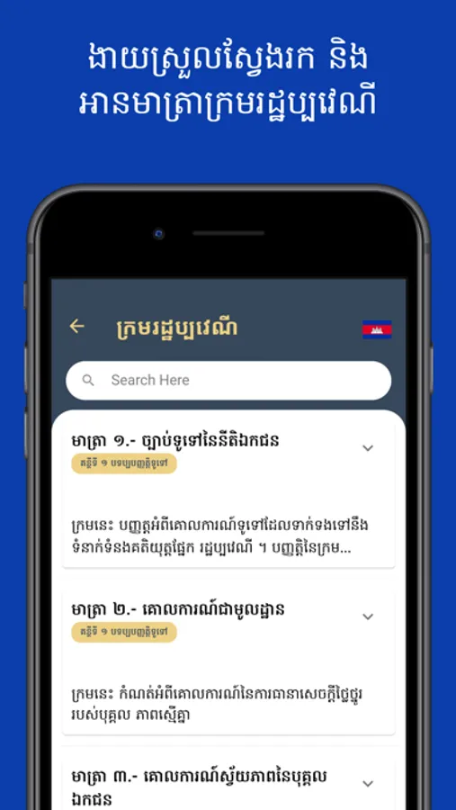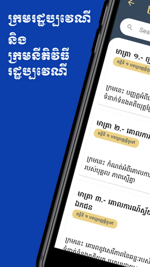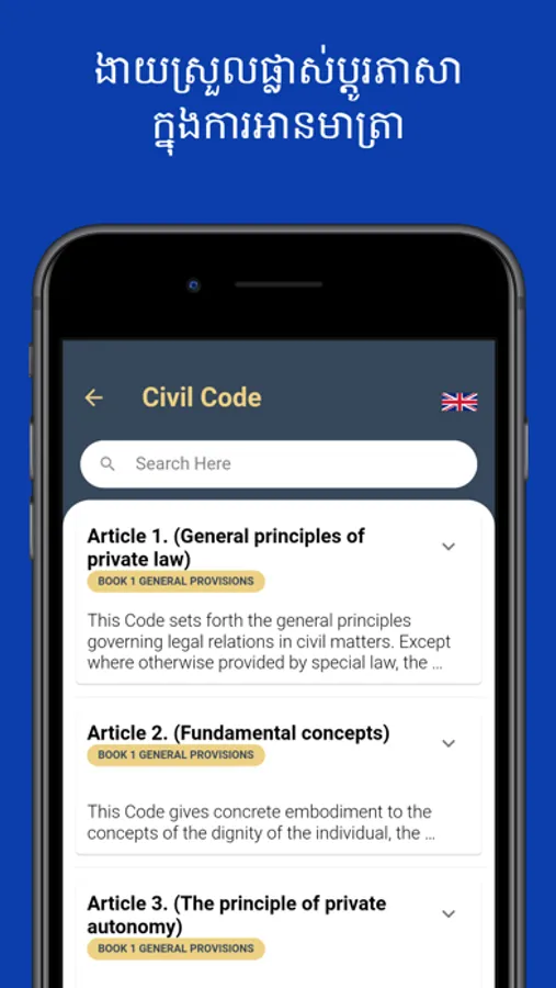 Cambodia Civil Code App provides search function for user to find any article based on keyword, article, chapter and more.