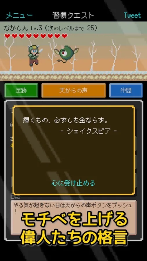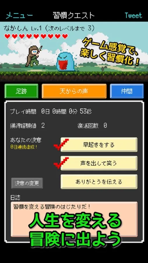 習慣を実行した分だけ経験値を得て、進化していきます。