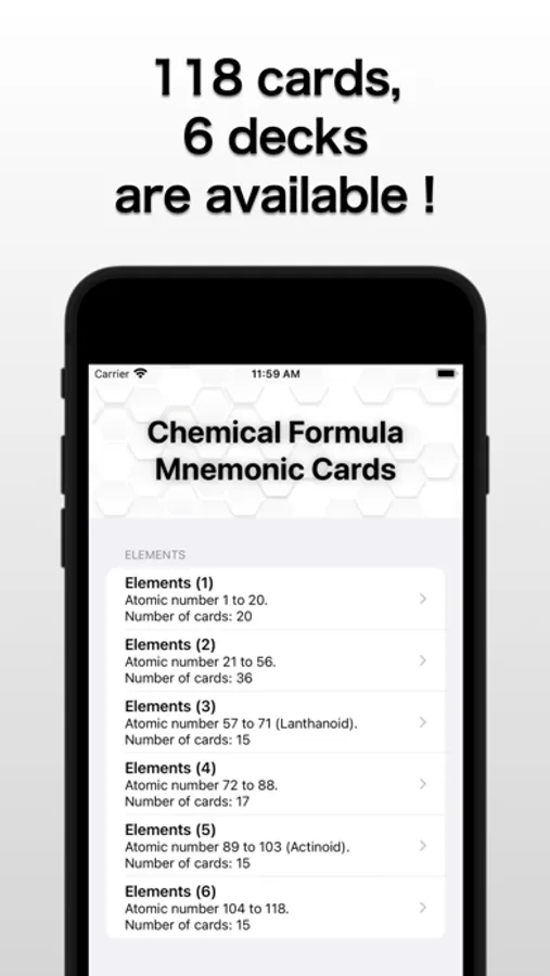 A total of 118 cards in 6 decks are available. You don't have to create cards yourself.