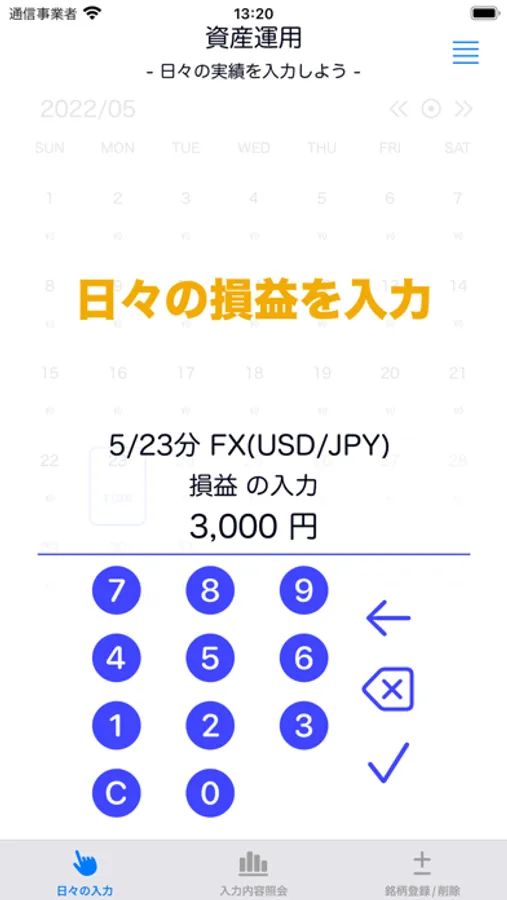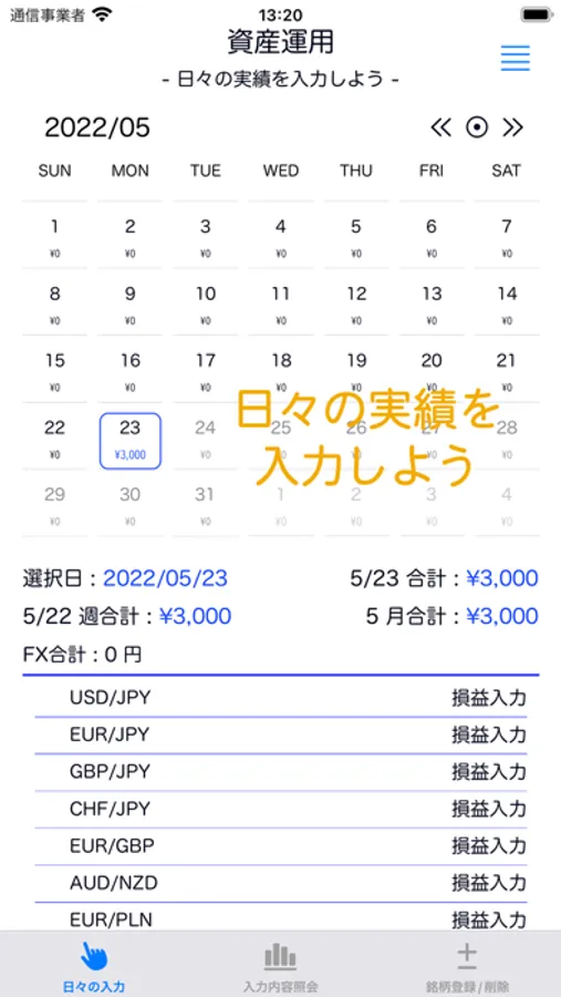 本アプリは日々の資産運用実績を入力することで、一覧表示・グラフ表示が可能なアプリです。