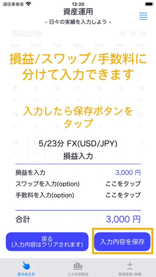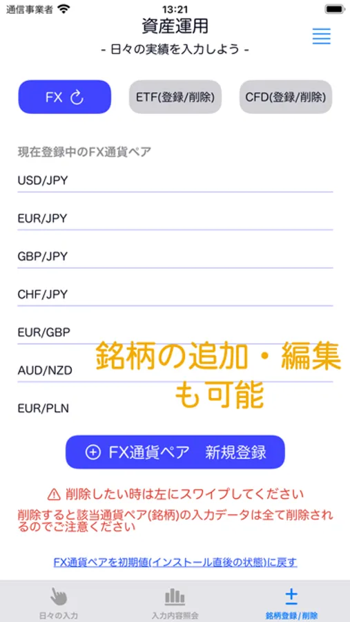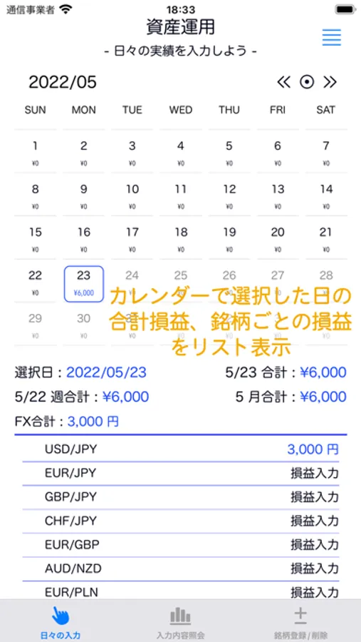 入力は銘柄ごとに損益・スワップ・手数料を入力可能です。