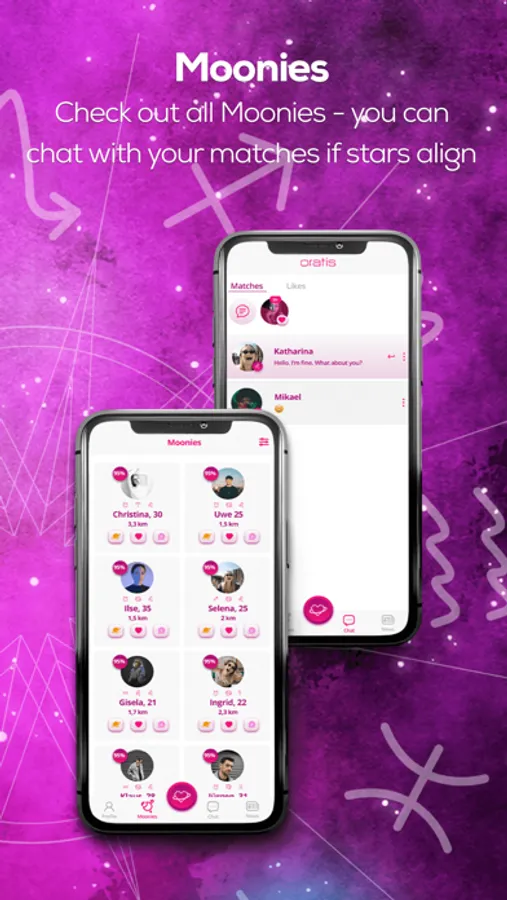 ORATIS calculates your Zodiac signs and shows you the astrological compatibility with each Moonie in percentages. You can see the Sun sign, the Ascendant and the Moon sign of your matches. The decision is up to you: Do you want to chat with Moonies with high astrological compatibility or not? Date individually as you like.
