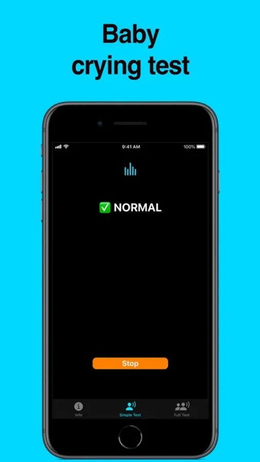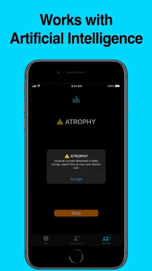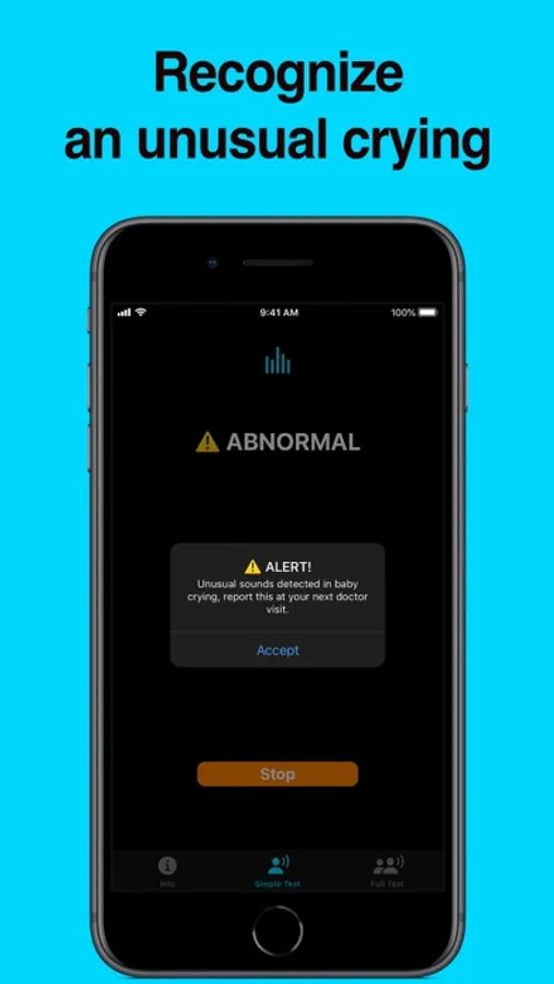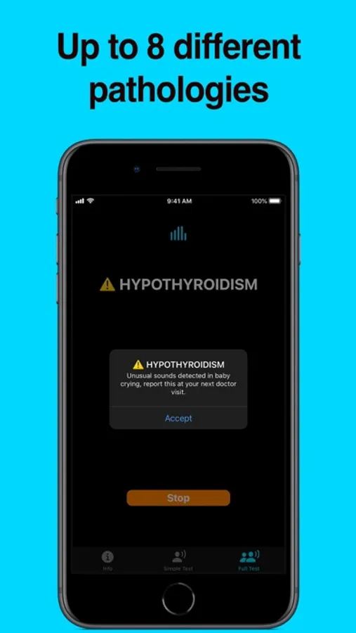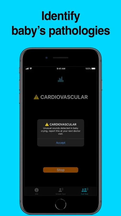 - Full Test: Notifies up to 8 pathologies detected in baby crying (Abnormal, Atrophy, Cardiovascular, Cornelia, Cat's cry, Hypothyroidism, Nervous system and Trisomy).