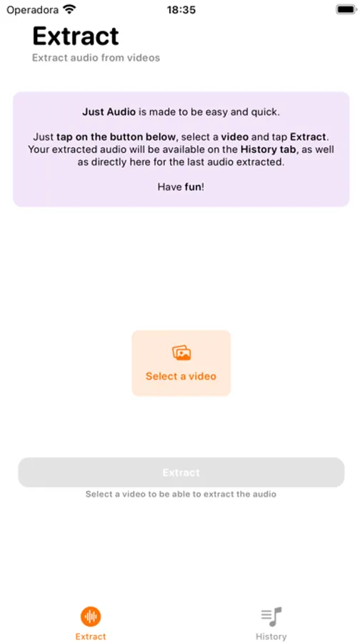 Just Audio is made to be easy and quick. Just select a video from your gallery that you want to extract the audio and... it's done! Your extracted audio will be available on the History tab, with all the possibilities of playing the audio, making it a favorite and sharing wherever you want or need. Just as simple as tapping a button, also having the possibility of sending as an audio message.
