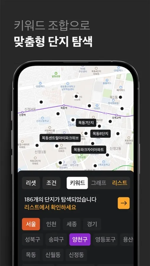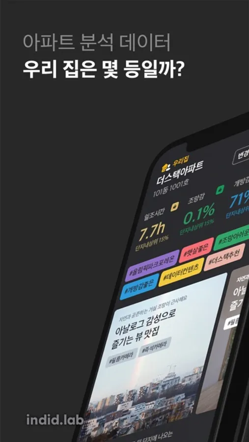 주거 공간의 새로운 의미를 발견할 수 있도록 분석 데이터의 사용자 경험을 제공합니다. 선호도 조절, 다양한 조건 선택 등 데이터 조작의 새로운 방식을 선보입니다. 이를 통해 분석 데이터의 탐색 및 직관적인 비교가 가능합니다.