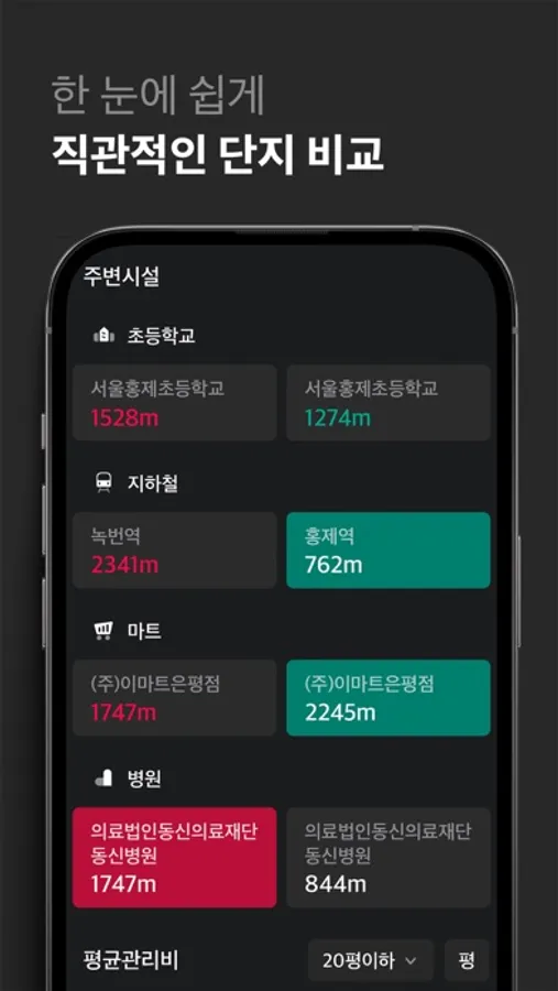 두 개 아파트의 환경 성능 데이터 및 기본 정보, 생활 편의 정보, 실거래가 등을 한눈에 쉽고 빠르게 비교해보세요.