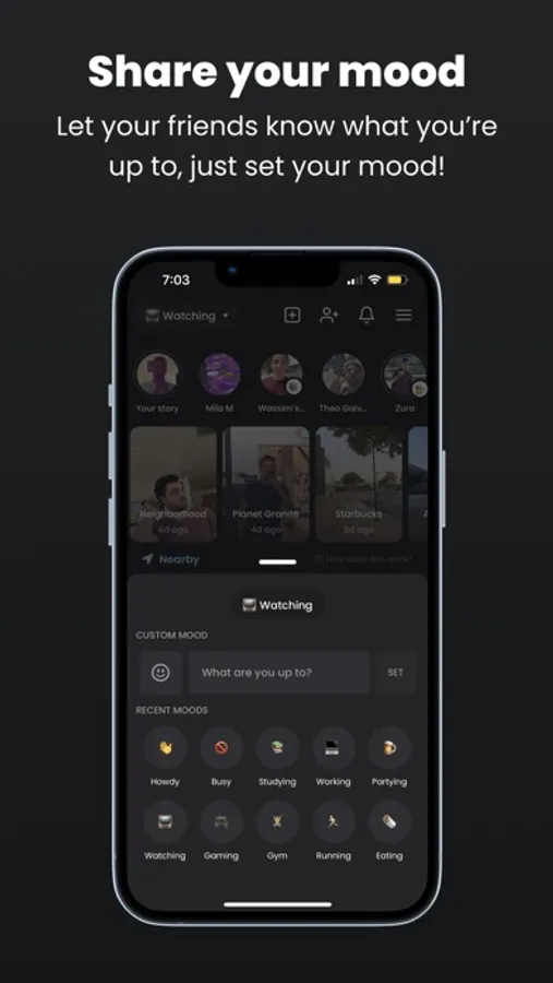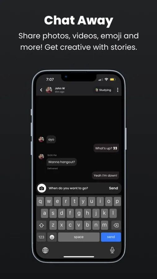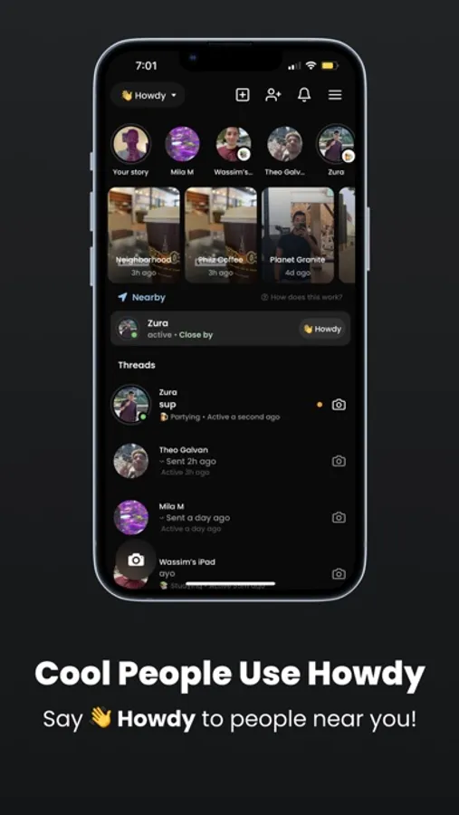 Create your Howdy account in seconds. Nearby friends, groups, stories and huddles appear instantly, so that you can join in on the fun and start chatting and sharing photos and videos! Works like magic!