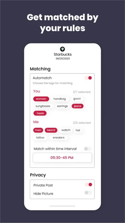 We trust you more than an algorithm to recognize your potential partner, so we're empowering you to express yourself freely and make connections independently. With Goneby, people control (1) the privacy of their posts (2) how they want to match with other posts (3) when and if they want to share their profile and identity with others.