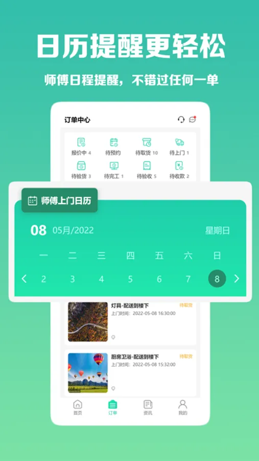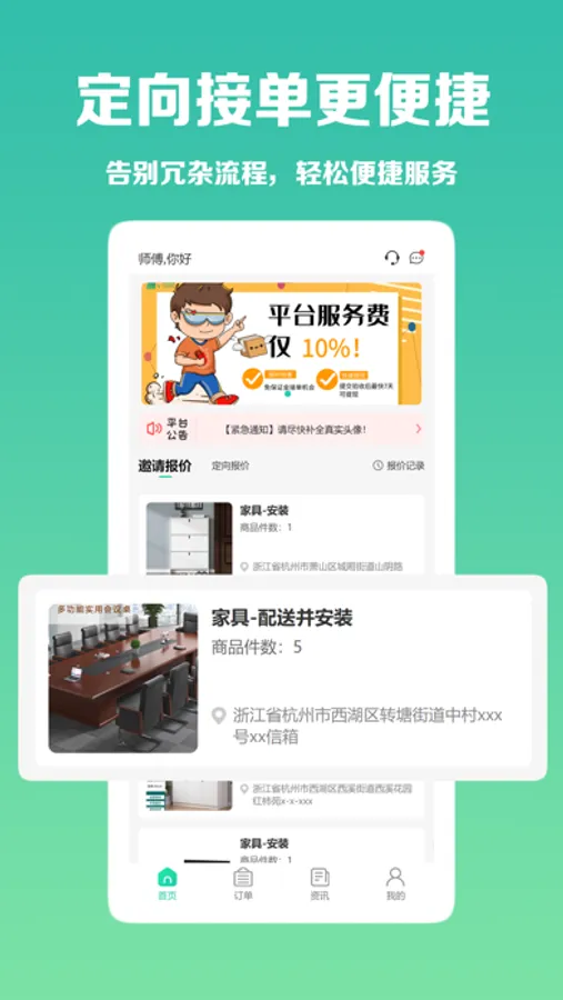 平台在合理监管以及明确订单信息的前提下给师傅更多的选择权利与经营空间;平台操作简单便捷,无需繁琐步骤,让师傅轻松上手。