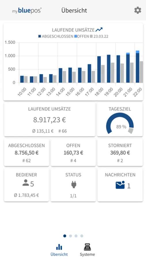 Erweitern Sie Ihre bluepos® Kasse um eine intuitiv zu bedienende und mobil nutzbare Alternative zu komplexen Backoffice-Lösungen. Ein zentrales Dashboard und übersichtliche Datenkacheln liefern jederzeit wertvolle Informationen zu verbundenen Systemen.