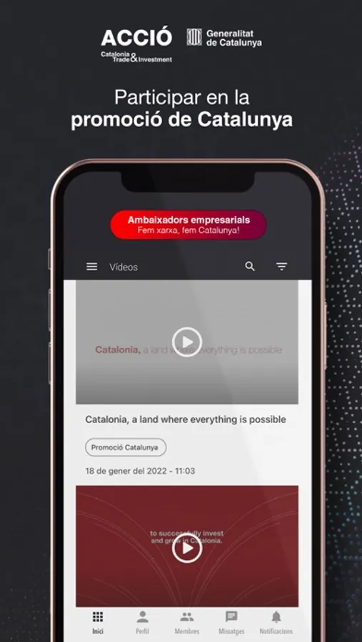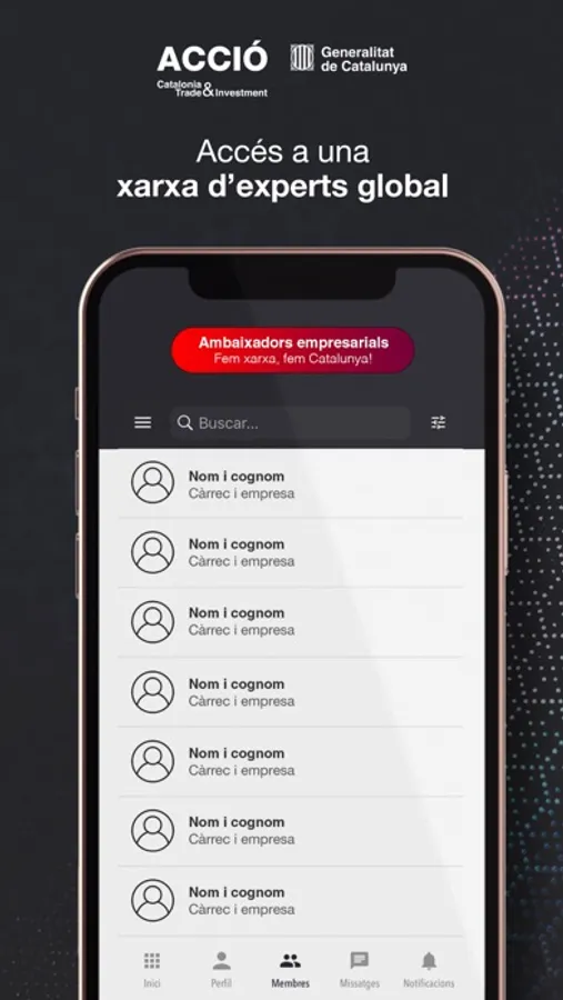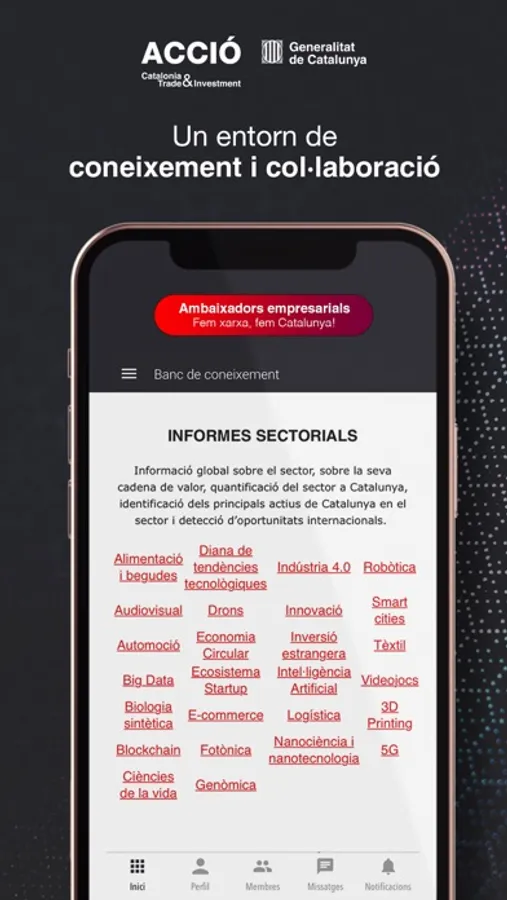 Ambaixadors Empresarials és una APP privada que permet els integrants de la Xarxa d'Ambaixadors Empresarials d'ACCIÓ accedir a informació rellevant i relacionar-se virtualment amb tots els membres de la Xarxa. És un espai que facilita l'entorn de coneixement i col·laboració, l'accés a una xarxa d'experts global i a informació estratègica i dades rellevants.