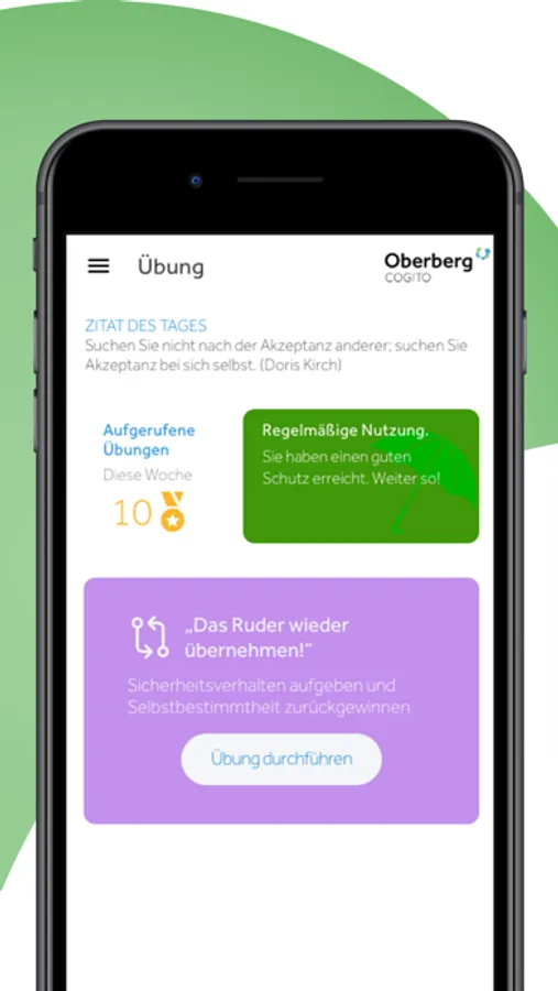 Wie wird OBERBERG COGITO eingesetzt? Jeden Tag erhalten Sie neue Übungen, um etwas für Ihr mentales Wohlbefinden zu tun. Die Übungen können leicht in den Alltag integriert werden. Bis zu zwei Push-Nachrichten erinnern Sie täglich an die Übungen (optionale Funktion). Sie haben außerdem die Möglichkeit, eigene Übungen oder Leitsätze zu ergänzen oder bestehende Übungen abzuwandeln. So können Sie die App und die enthaltenen Übungen ganz auf Ihre eigenen Bedürfnisse anpassen. Die App passt sich jedoch nicht automatisch dem Nutzungsverhalten an (es wird auf einen Lernalgorithmus verzichtet), da die App und ihre Nutzung vollständig anonym funktionieren und keine Daten aus den Übungen gespeichert werden.