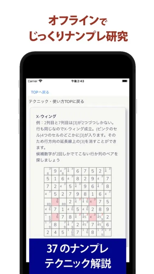 オフラインでゆっくり解くことができます。ちょっとした隙間時間や通勤通学のお供に使えますし、じっくり難問を楽しむこともできます(広告表示でパケットは使います)