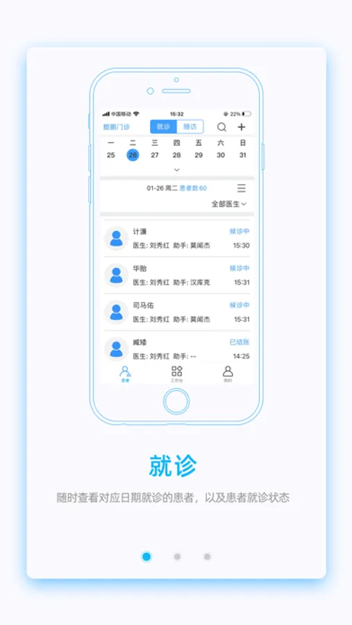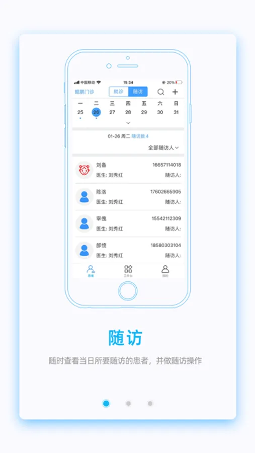 [患者]:查看就诊的患者信息,查看随访的患者信息,添加患者,搜索患者、新增预约等。