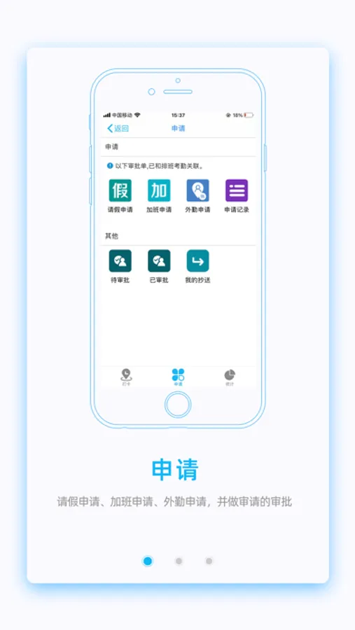[工作台]:考勤打卡,请假、加班、外勤申请,统计考勤信息。