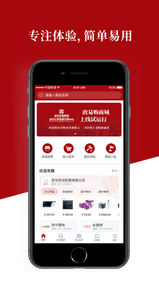 政采E商城APP搭建深圳全市非政府采购货物和服务“一网通办”电子卖场,开设乡村振兴馆、疫苗馆、绿色建材管主题特色场馆和专区,面向残疾人搭建辅具商城购买服务。