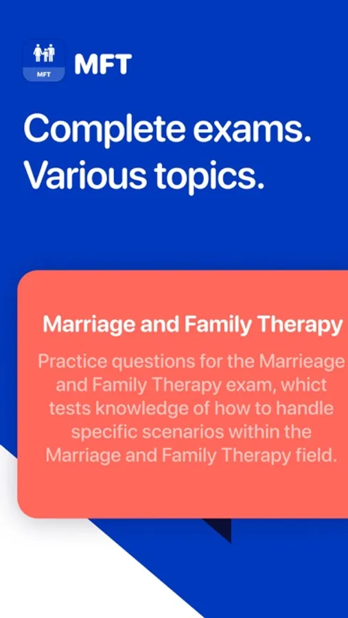 Pass your MFT Examination (Marriage and Family Therapy) with flying colors and become a certified professional! Boost your confidence in passing the first time with our mobile app and a personal study plan based on your current skill and requirements.