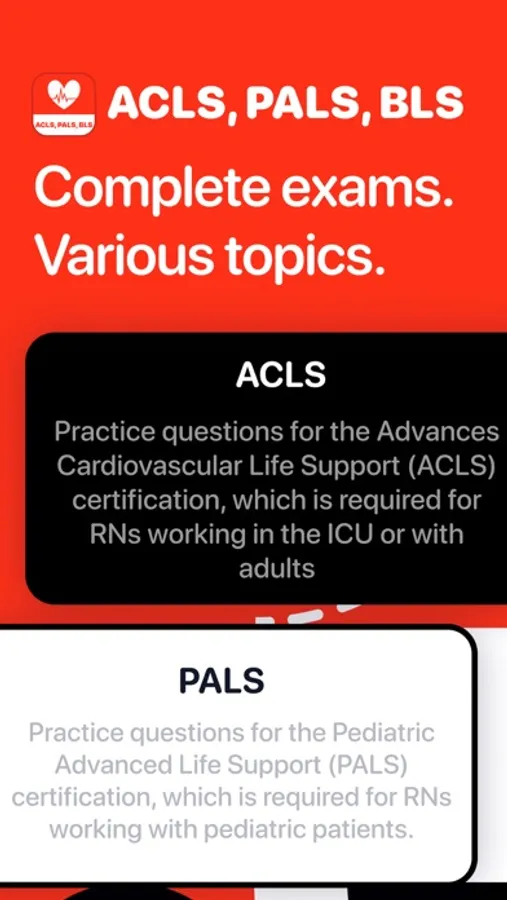 The app offers practice questions for three certifications: Advanced Cardiovascular Life Support (ACLS) certification, Pediatric Advanced Life Support (PALS) certification, and Basic Life Support (BLS) certification.