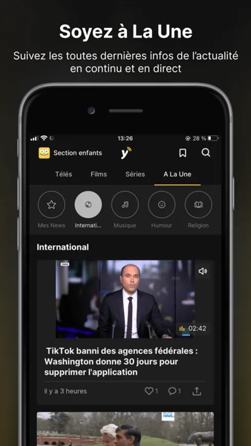 • Soyez informer des dernières Actualités, à travers le tout nouveau menu À LA UNE, sur différentes rubriques telles que Journaux TV, International, Afrique, Sport, Musique, Économie, Culture etc.