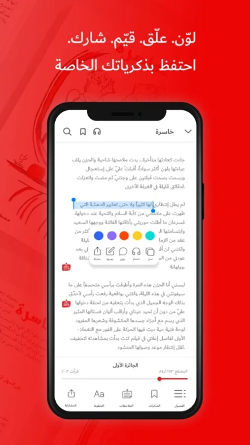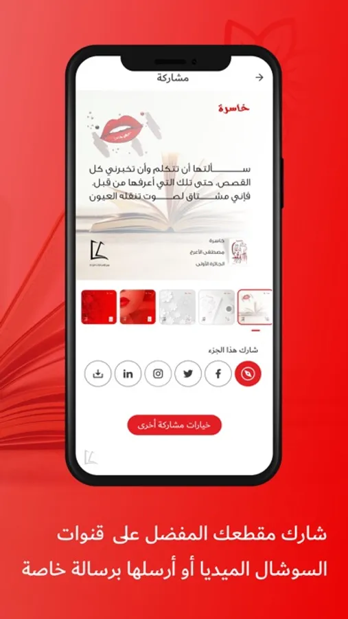 تفاعل مع كتاب الواقع "خاسرة" داخل هذا التطبيق وكذلك على منصات التواصل الاجتماعي. عبّر عن رأيك. تكلم مع أصدقائك ومع جمهور الرواية وحتى مع الشخصيات. اعرف كل شيء وشارك في كل شيء. نتمنى لكم رحلة ممتعة.