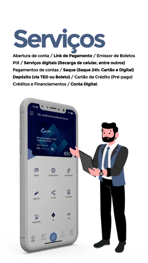 "Abra sua conta digital no LMC Bank. Evoluímos cada vez mais para que você tenha a melhor experiência, O LMC Bank oferece uma conta corrente completa e totalmente gratuita!