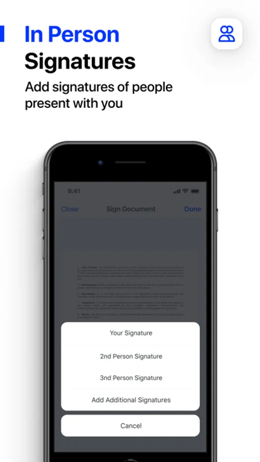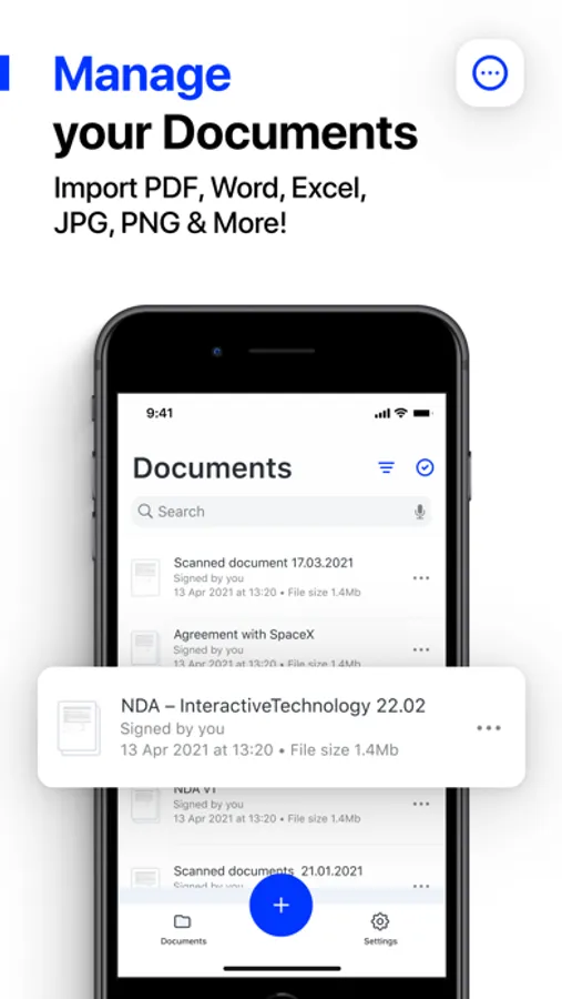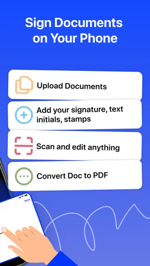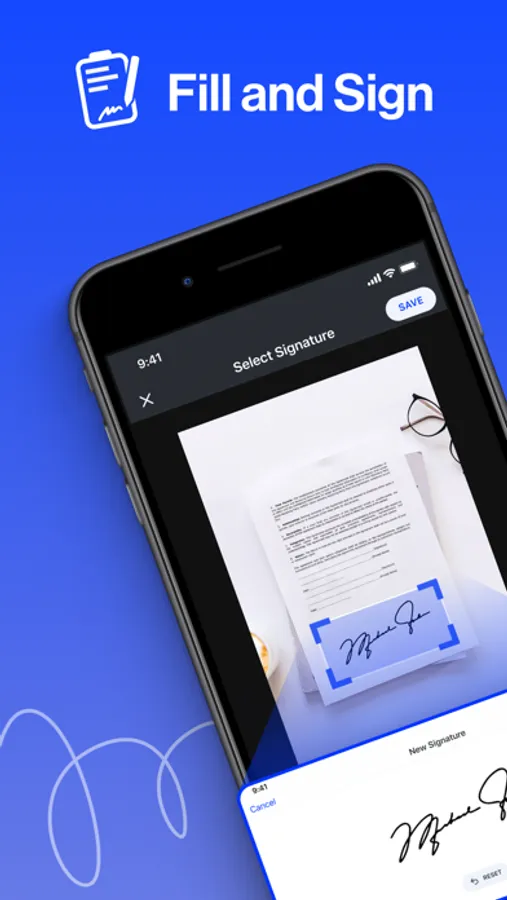 Sign documents yourself - Easily insert your signature to any document with your finger. Or simply take a photo of a document with your handwritten signature.