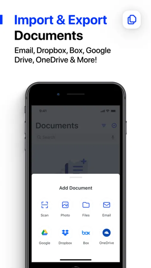 • Import and export documents - Import documents from email, Dropbox, Box, Google Drive, OneDrive and other cloud storage