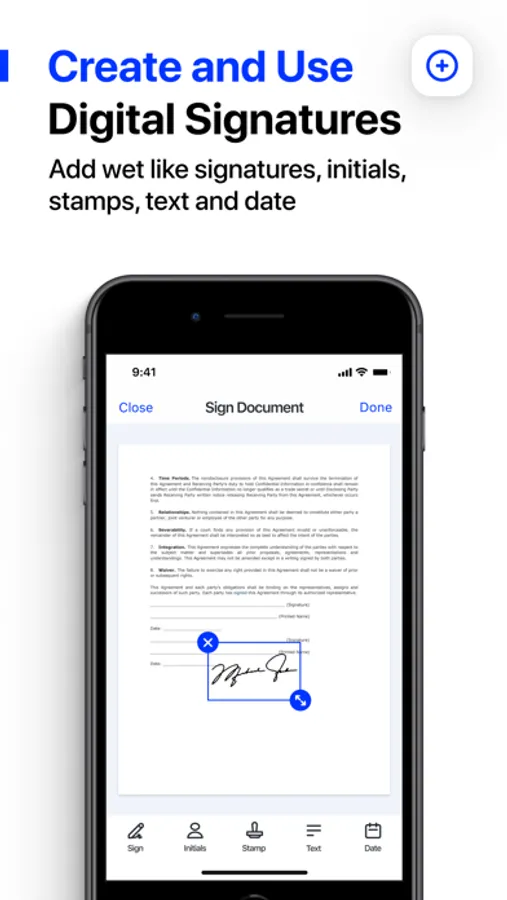 Create and use digital signatures – easily add signatures to your digital documents. Sign and share documents either in-person with other people present with you or digitally send the document to other remote people for signature from wherever you are.