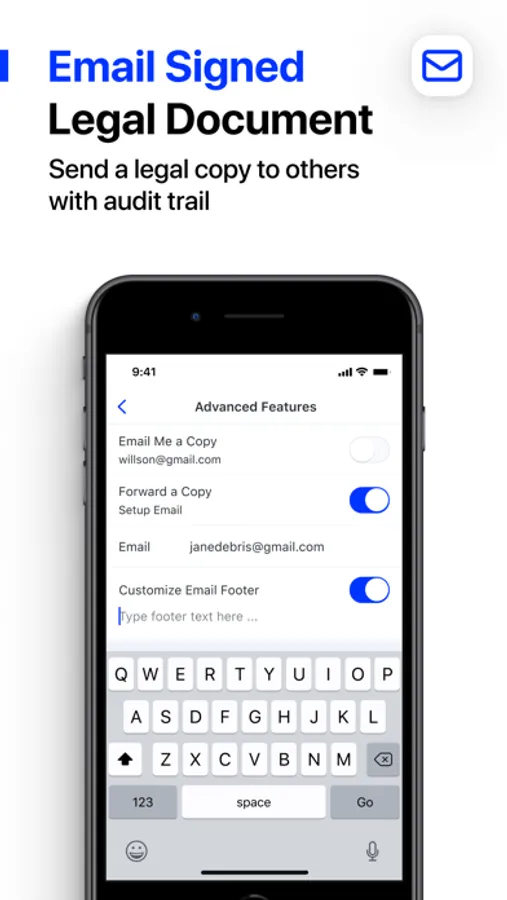 • Legally binding with audit trail - Create documents with legal signatures shared with others