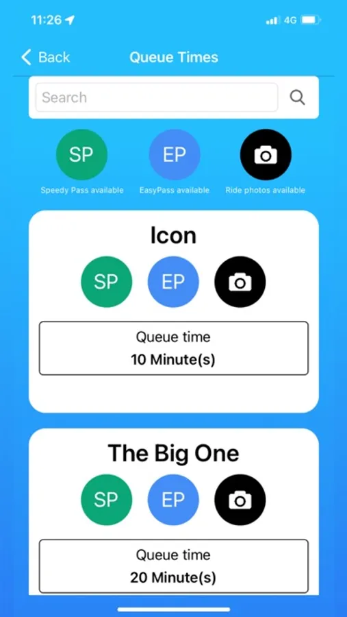 Ride Queue times – Get up to the minute ride queue times and book Speedy One's for applicable rides.