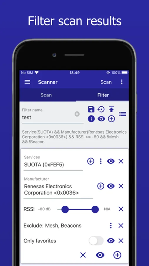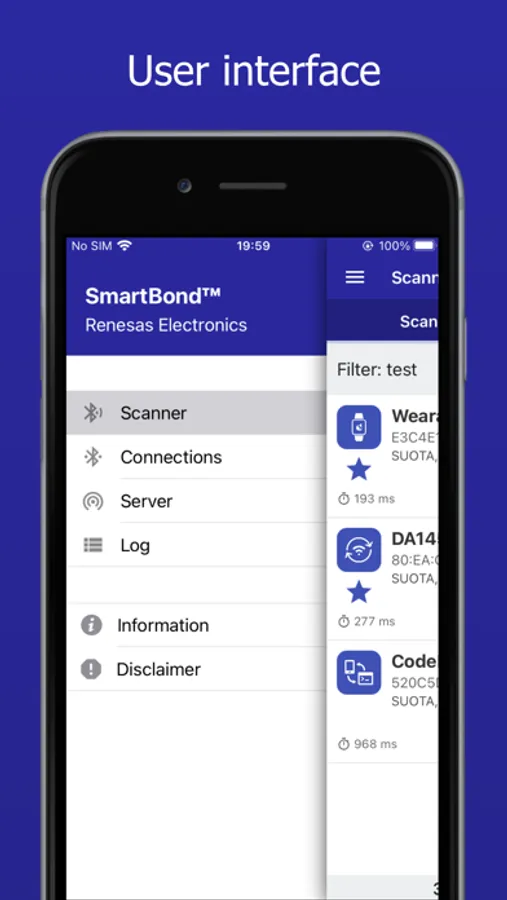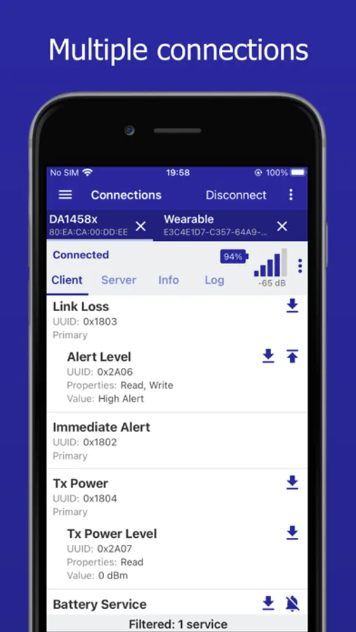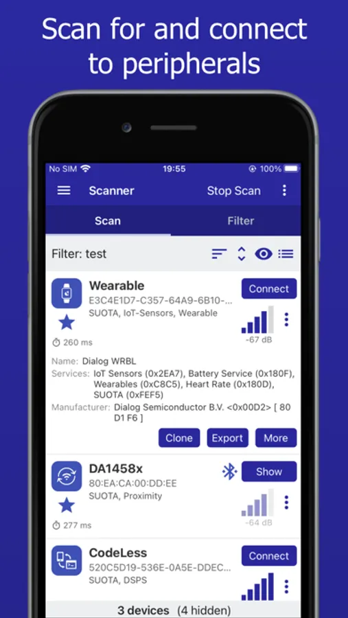 With the app you can scan for and connect to Bluetooth® Low Energy peripherals. Multiple connections and scan filtering are supported. You can also use the app in peripheral mode, so that other devices can scan for and connect to it.