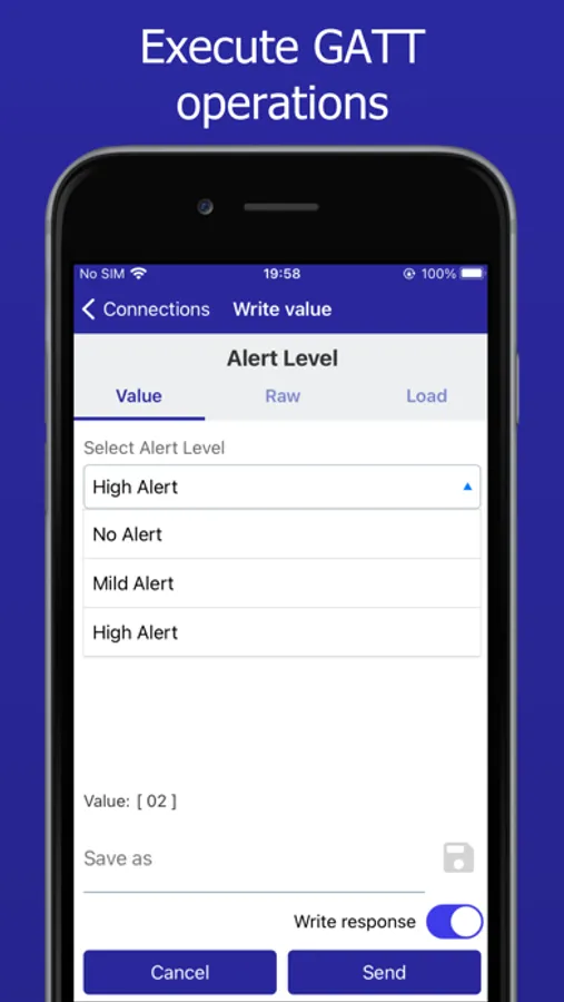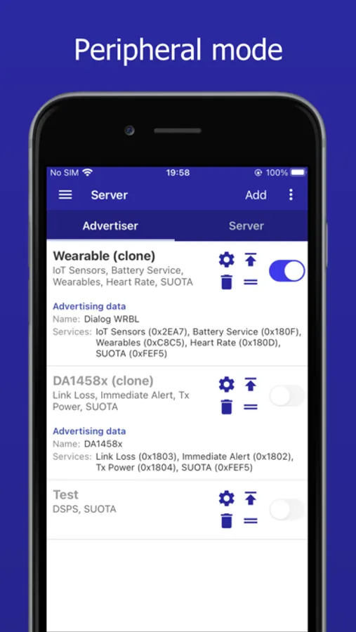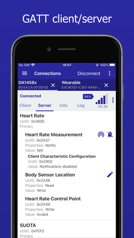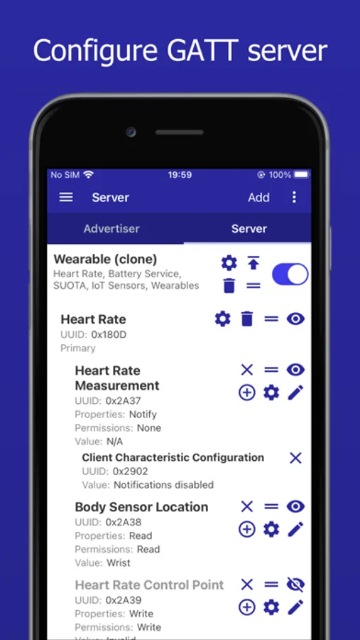 The app can act both as GATT client and GATT server. All GATT operations are supported. The app recognizes the Bluetooth® SIG adopted GATT objects, which are displayed with their proper names, their values are parsed and displayed as text, and, where supported, a custom write user interface is available. You can configure the GATT server and peripheral mode, either directly, or by cloning existing peripherals.